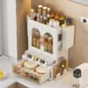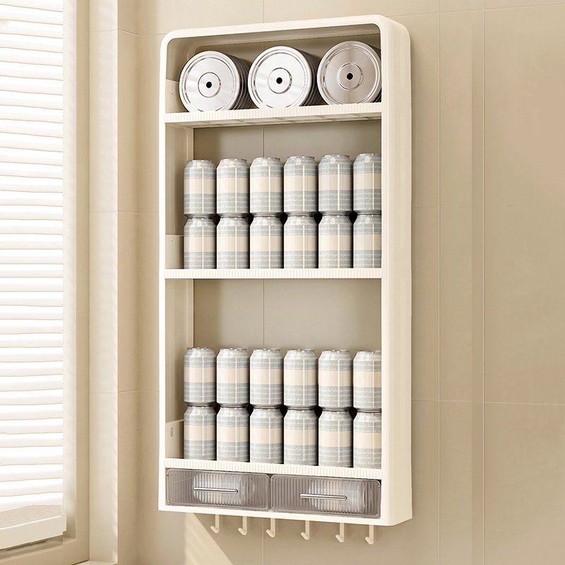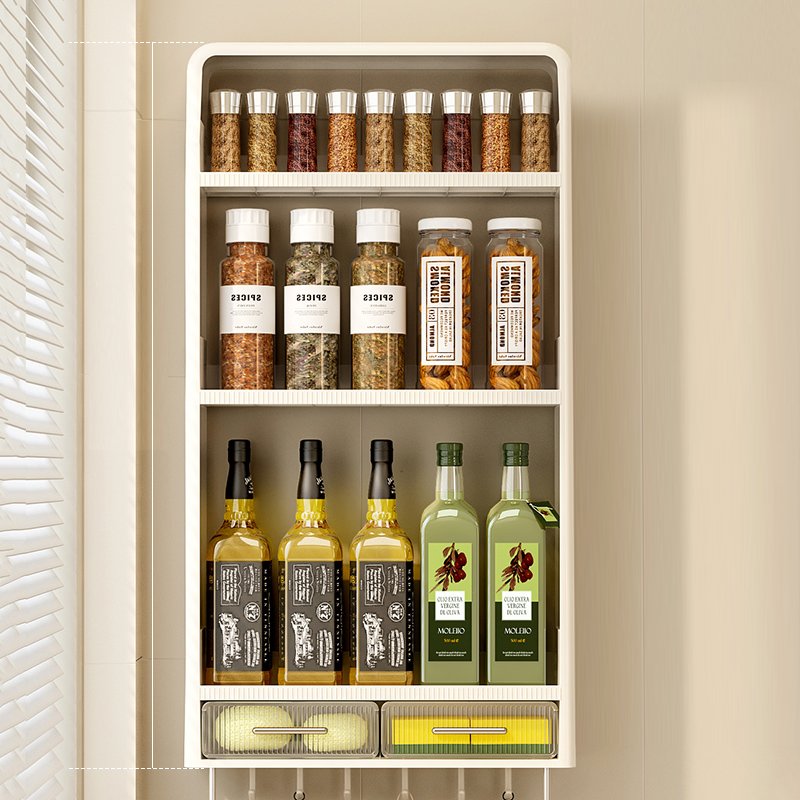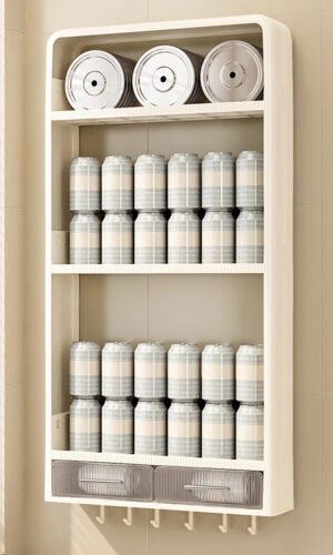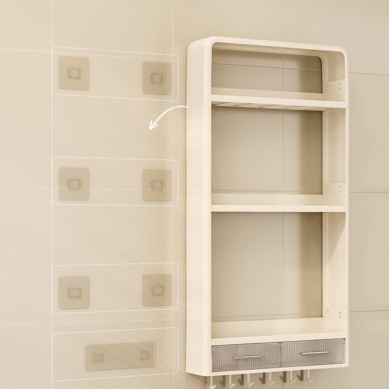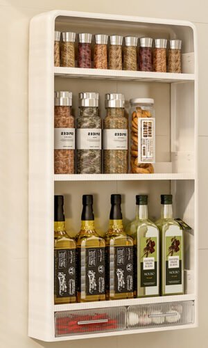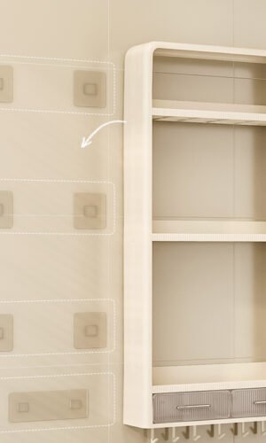 Ce support mural comporte plusieurs niveaux en plastique waterproof montés sur une structure légère. Il se fixe au mur sans vis apparentes (adhésif PVC ou système sans perçage). Idéal en cuisine, salle de bain ou salon pour ranger huiles, produits de beauté, épices ou décoration compacte.